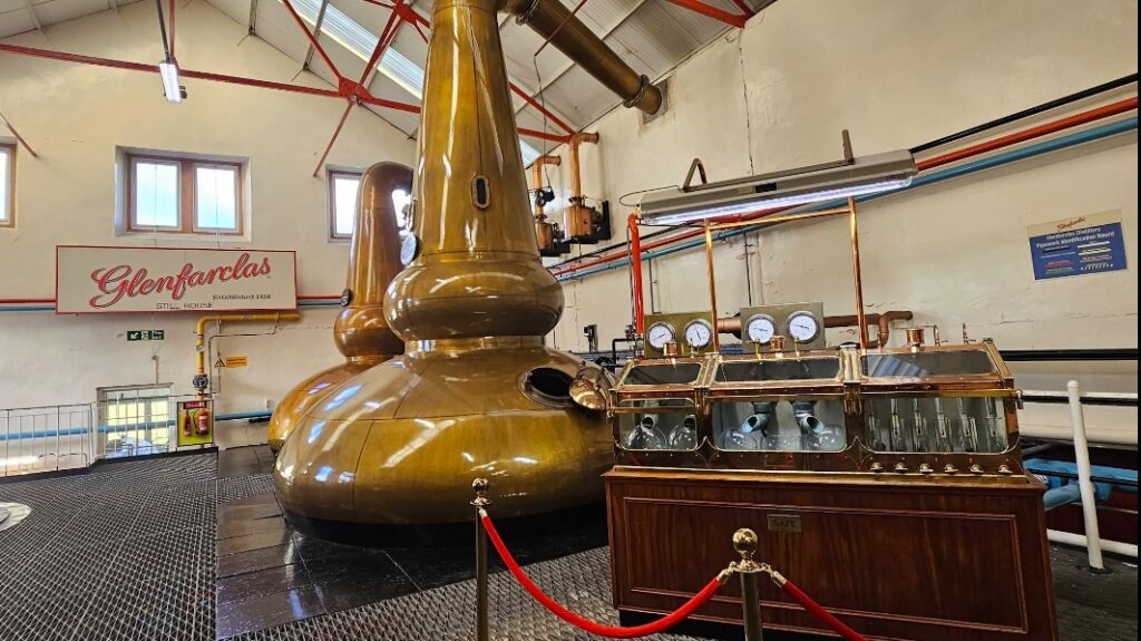 グレンファークラス蒸留所がこだわる「ガス直火蒸留」はポット底に局所的高温を生み、強い対流と銅接触を促進することで、厚みのある酒質と焼き菓子様の甘香、わずかな香ばしさを伴う力強いニューポットを形成する。
